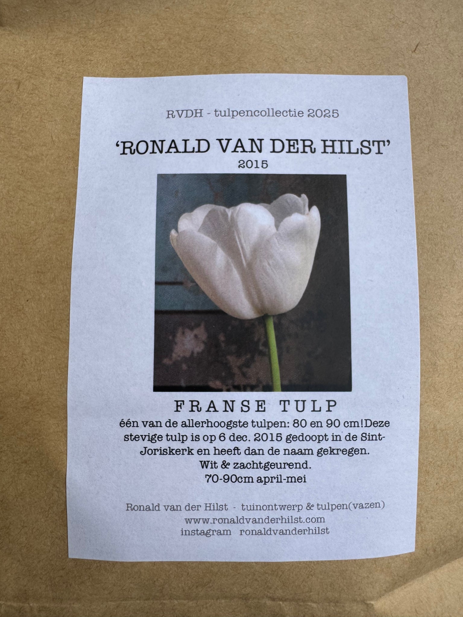The ‘Ronald van der Hilst’ tulip is white with a small yellow heart and has a light perfume.